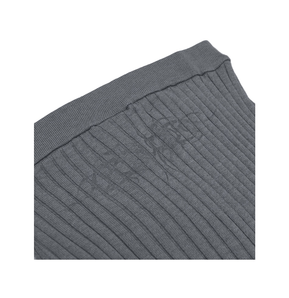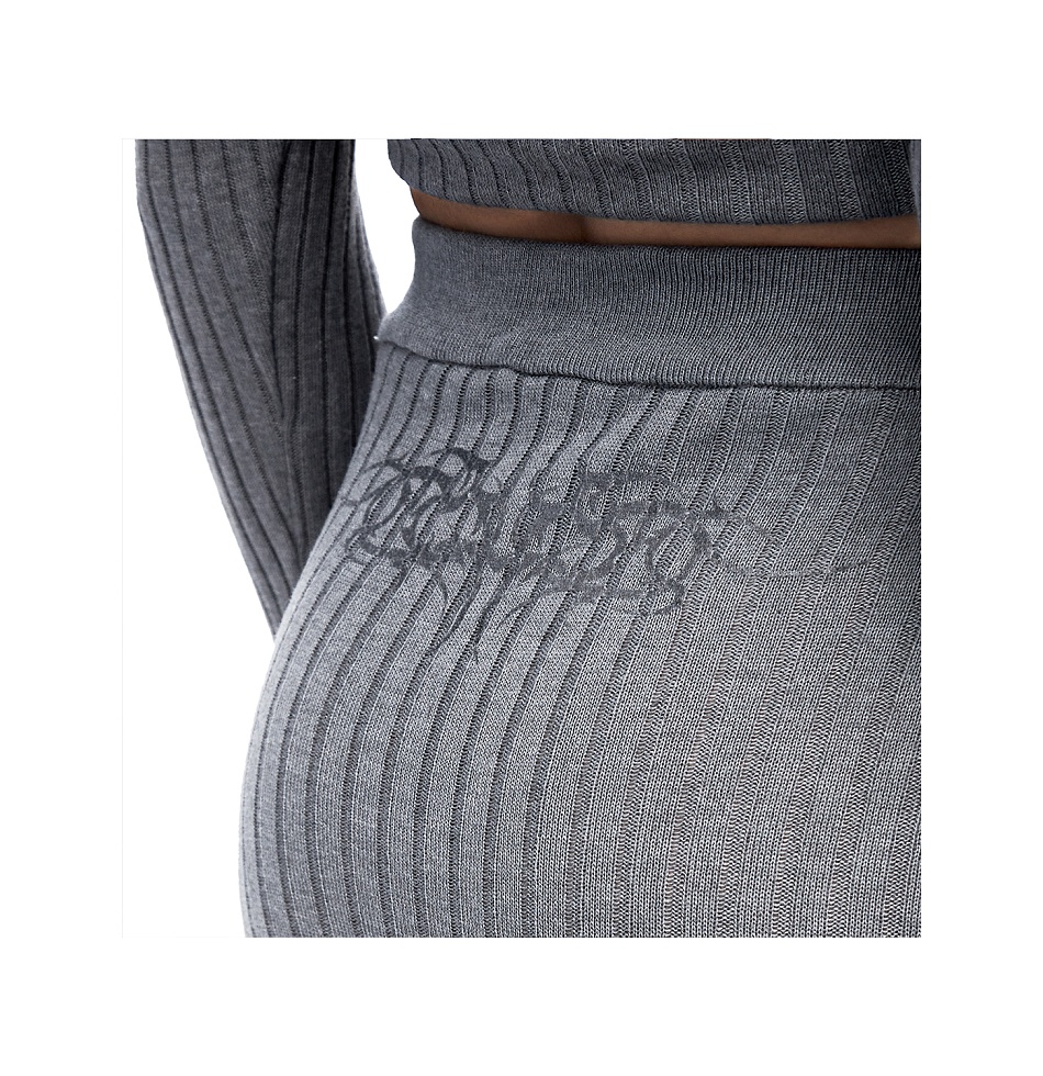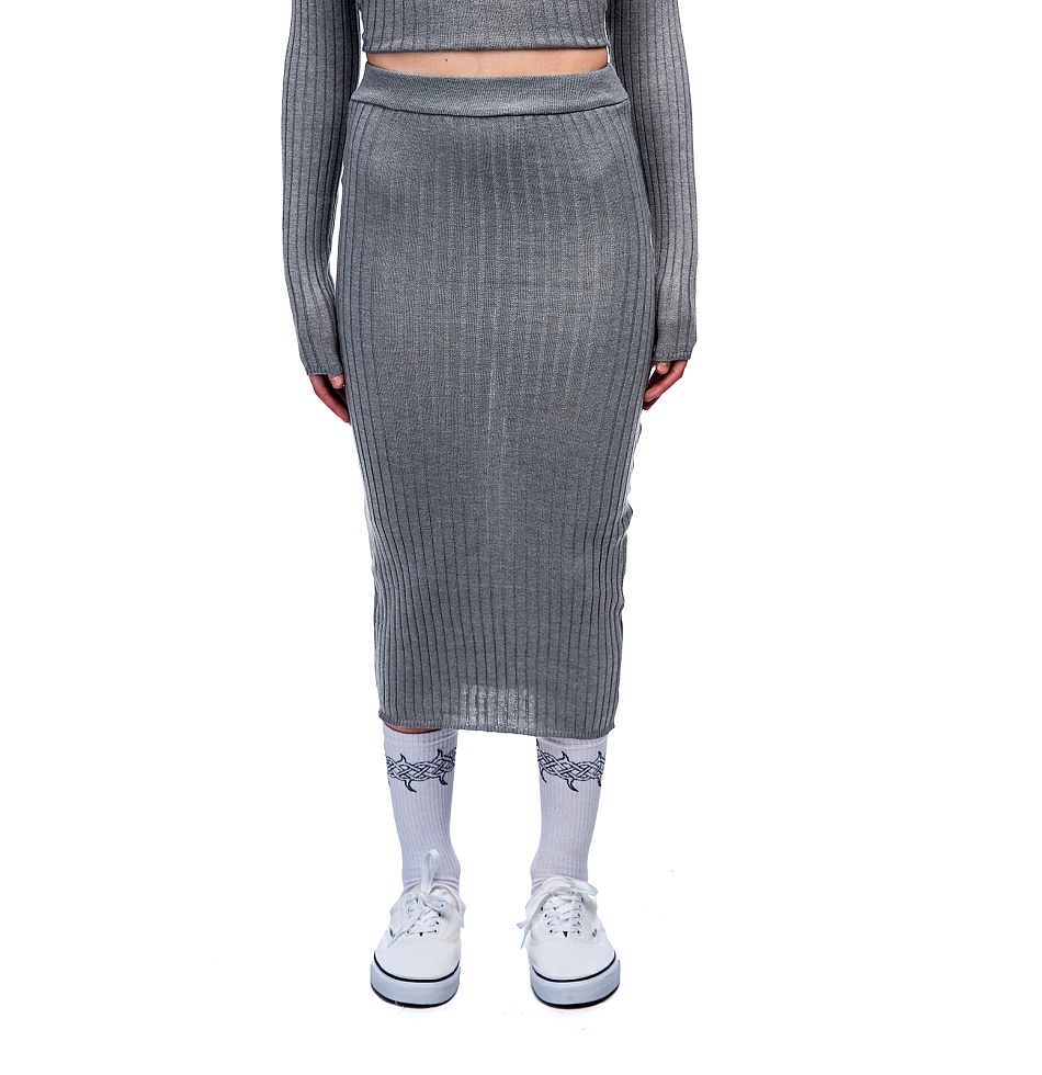 Юбка прямого кроя из тонкого трикотажа в крупный рубчик. Пояс на резинке, миди-длина, печать прозрачным гелем. На Элине – размер S, ее рост 157 см.