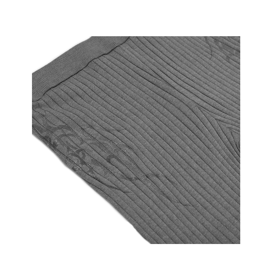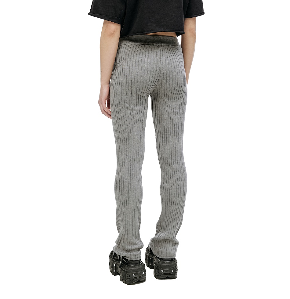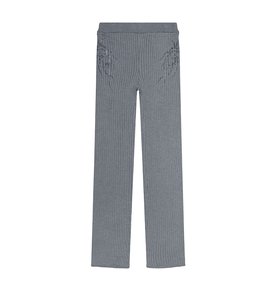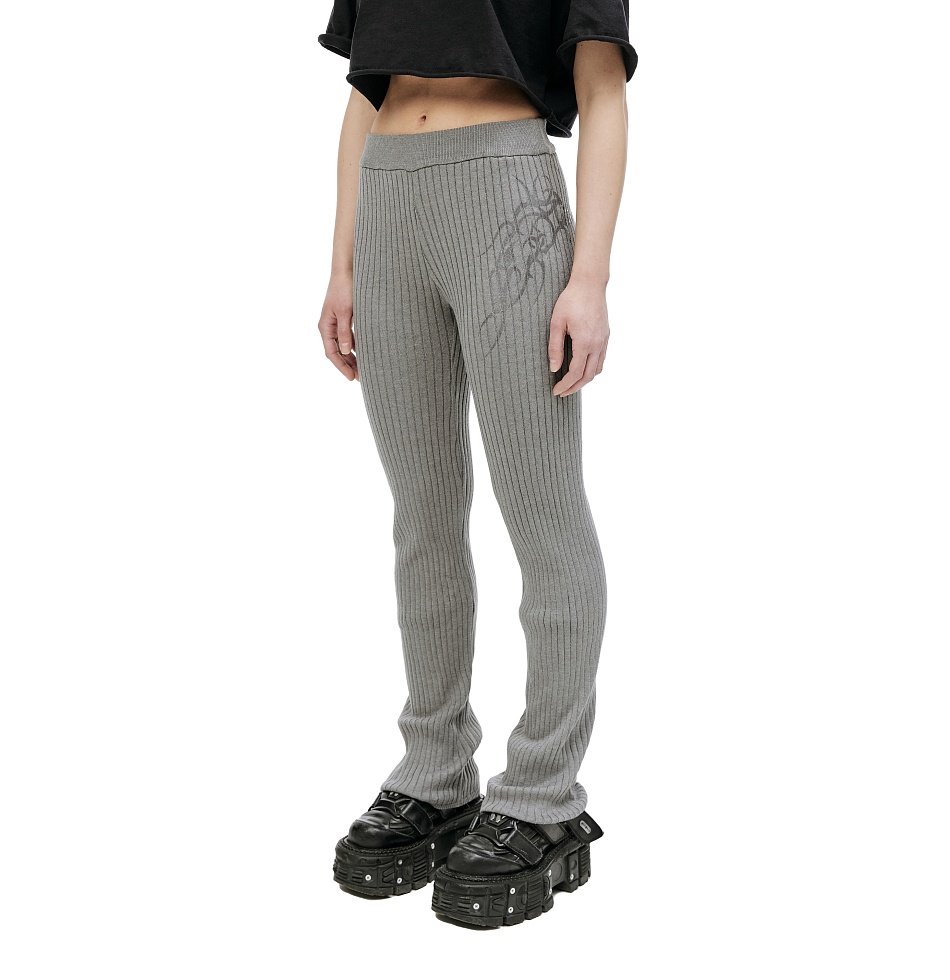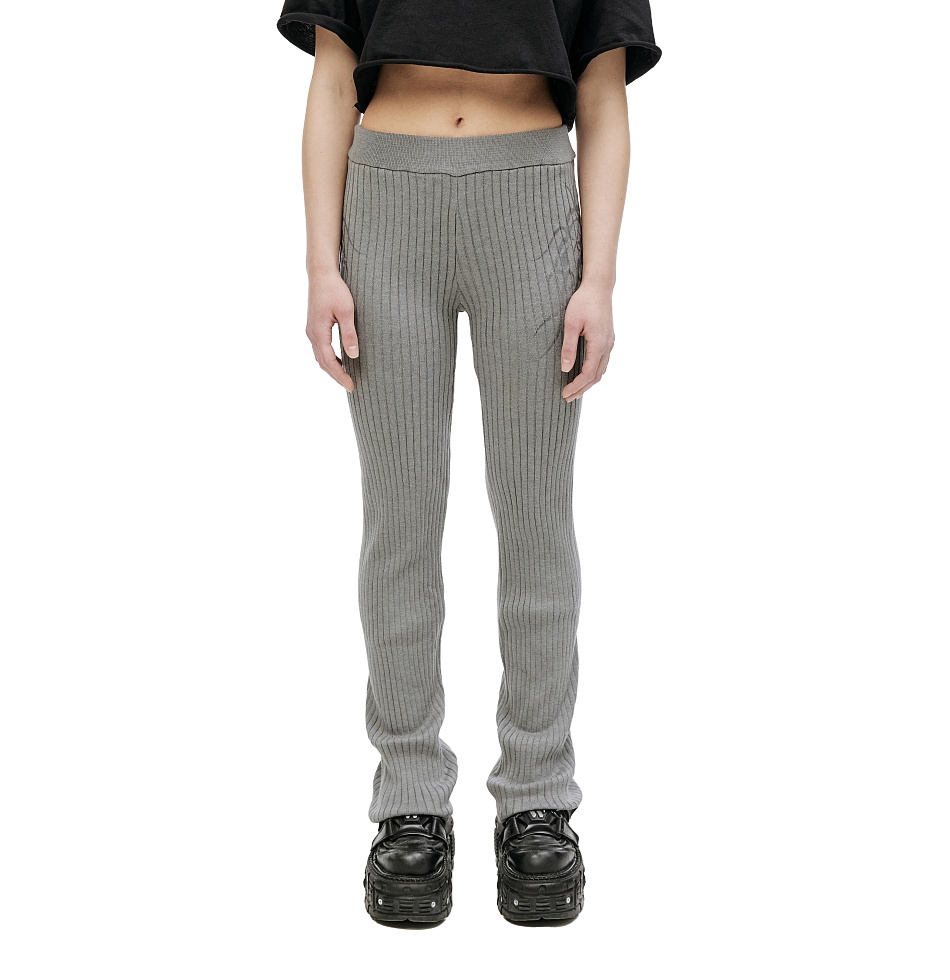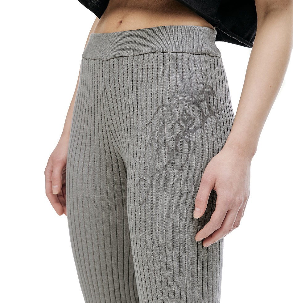 Брюки прямого кроя из тонкого трикотажа в крупный рубчик. Пояс на резинке, высокая посадка, печать прозрачным гелем. На Элине – размер XS, ее рост 157 см.