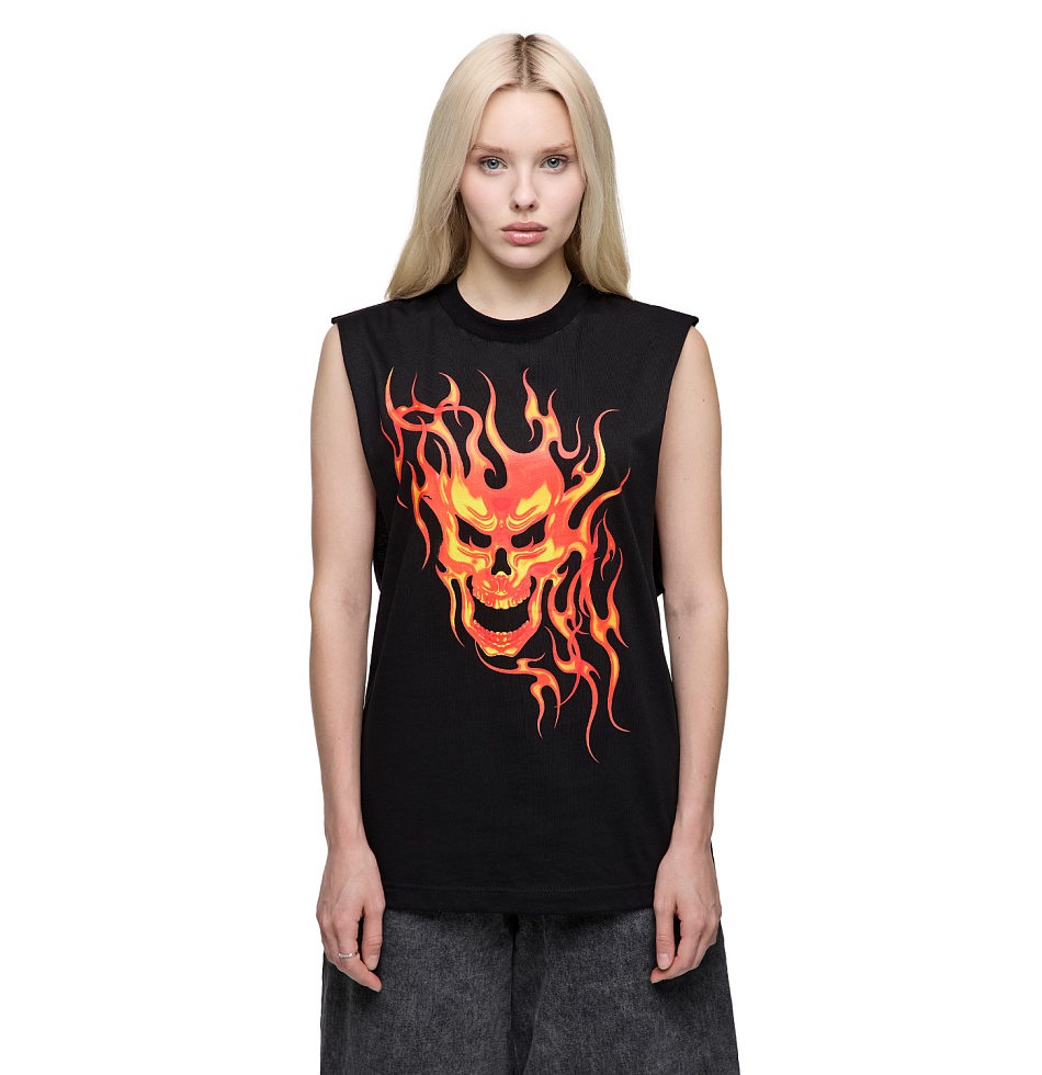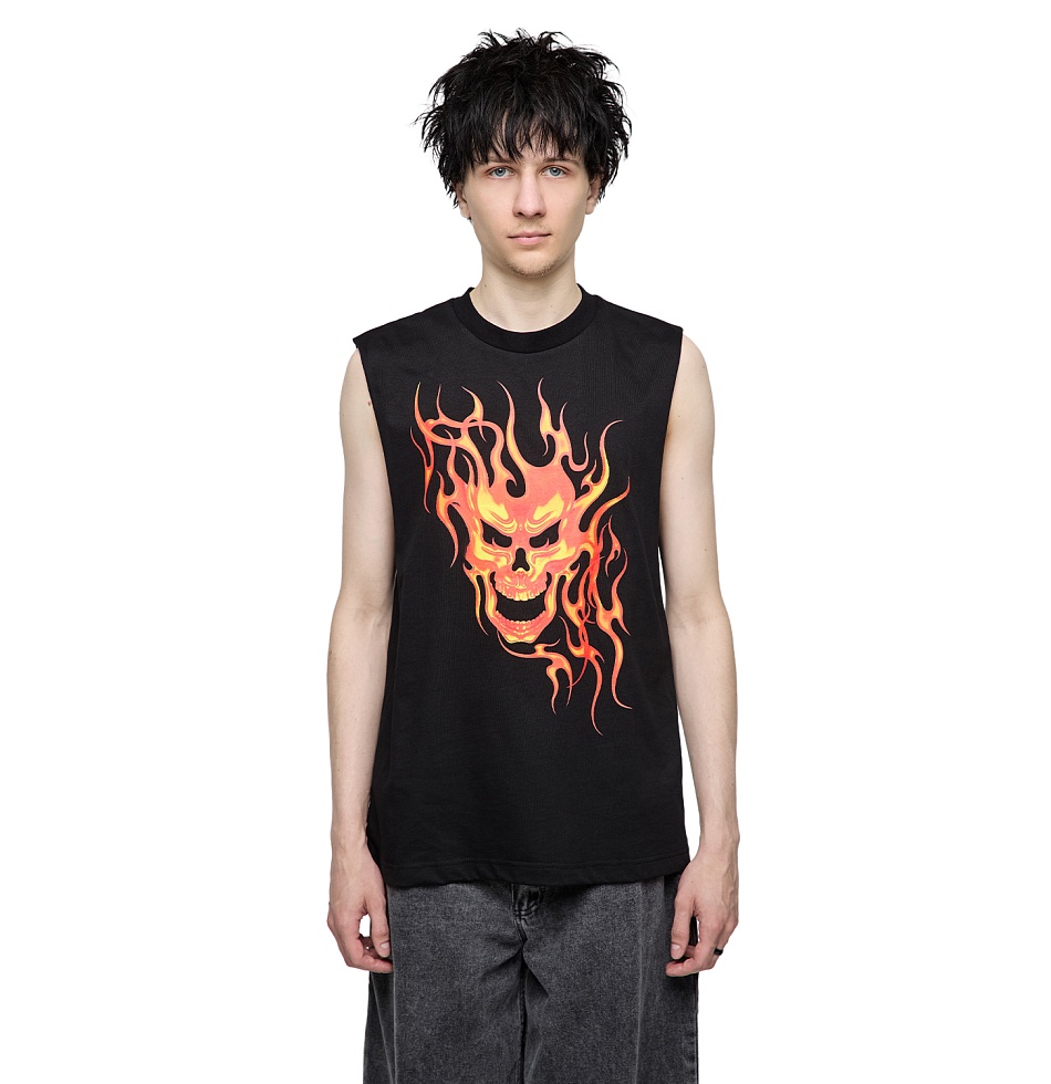 Майка свободного кроя с круглым вырезом, горловина обработана окантовкой в рубчик, приспущенная линия плеча, принт шелкография. Плотность: 200 гр/м2.