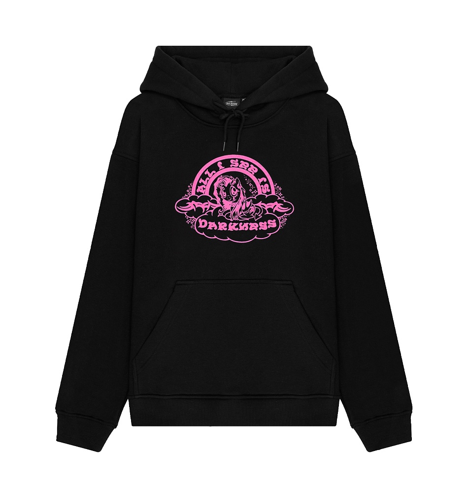 Худи свободного кроя из плотного футера, приспущенная линия плеча, втачной рукав, затягивающийся на шнурок капюшон, накладной передний карман, принт шелкографией.