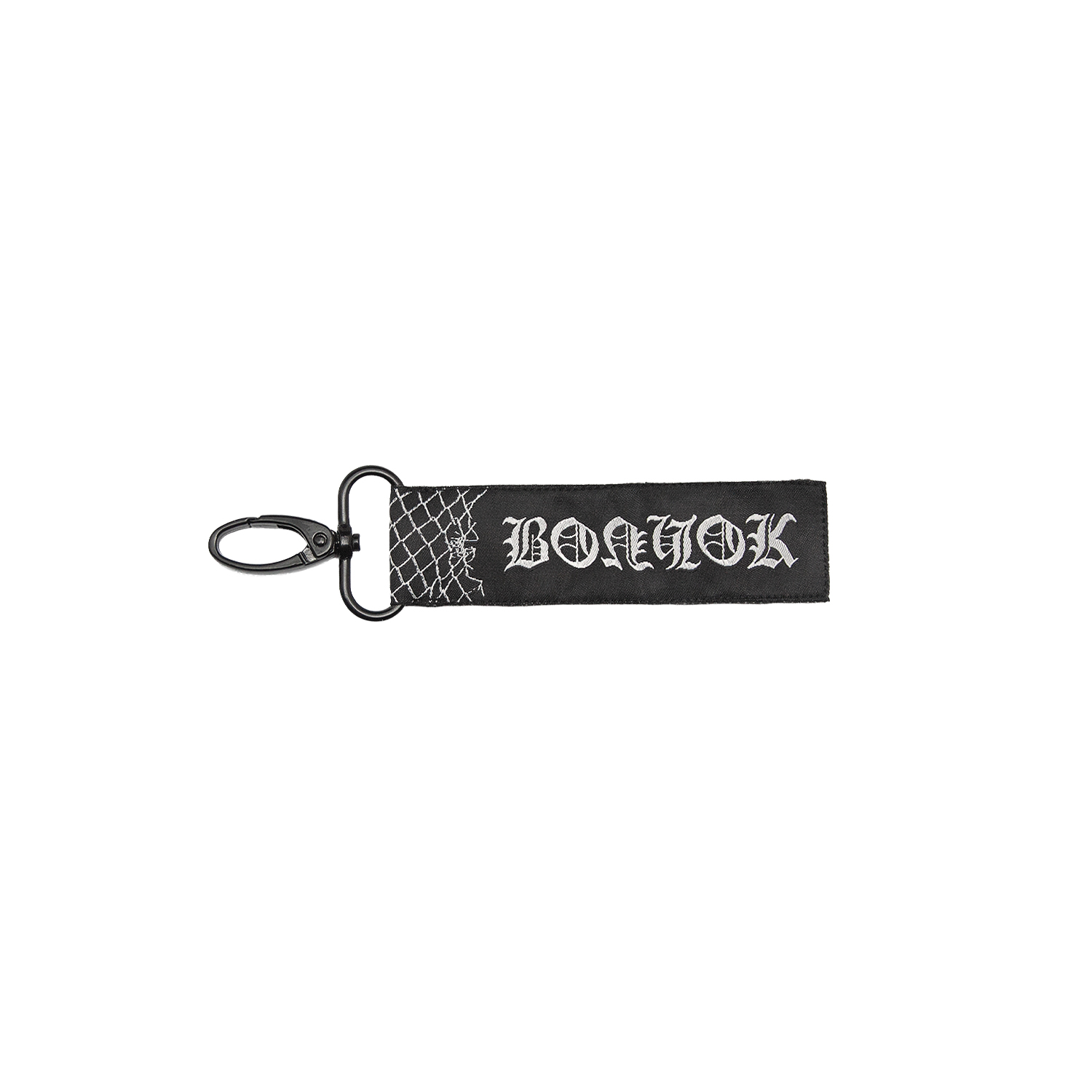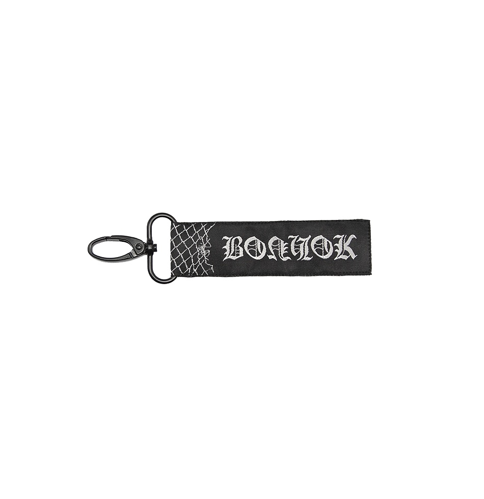 Двусторонний текстильный брелок с логотипом. Черная фурнитура, застежка на зажиме.