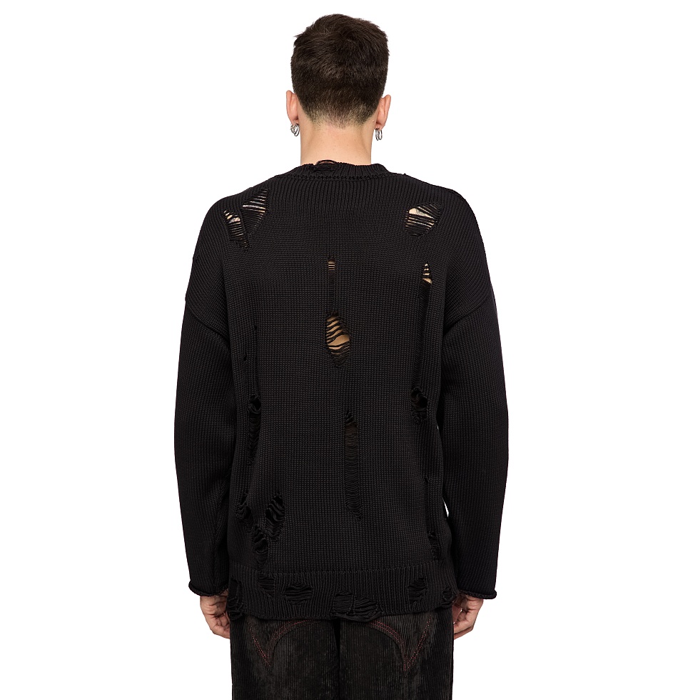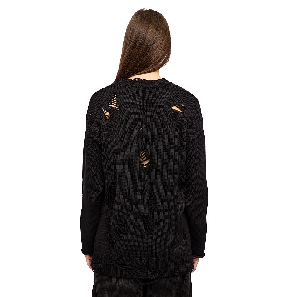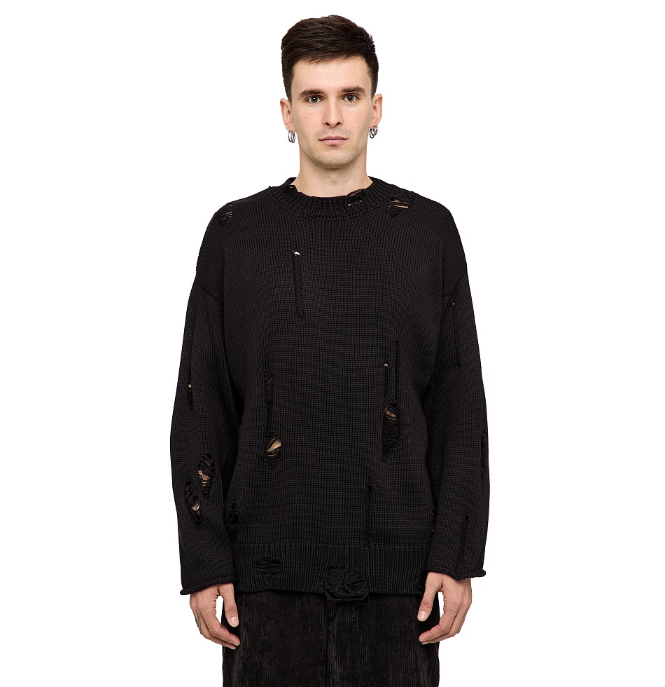Удлиненный вязаный джемпер с жаккардорм, свободный крой, декоративные дырки, спущенная линия плеча.
