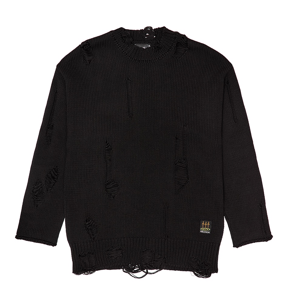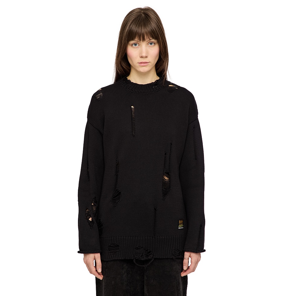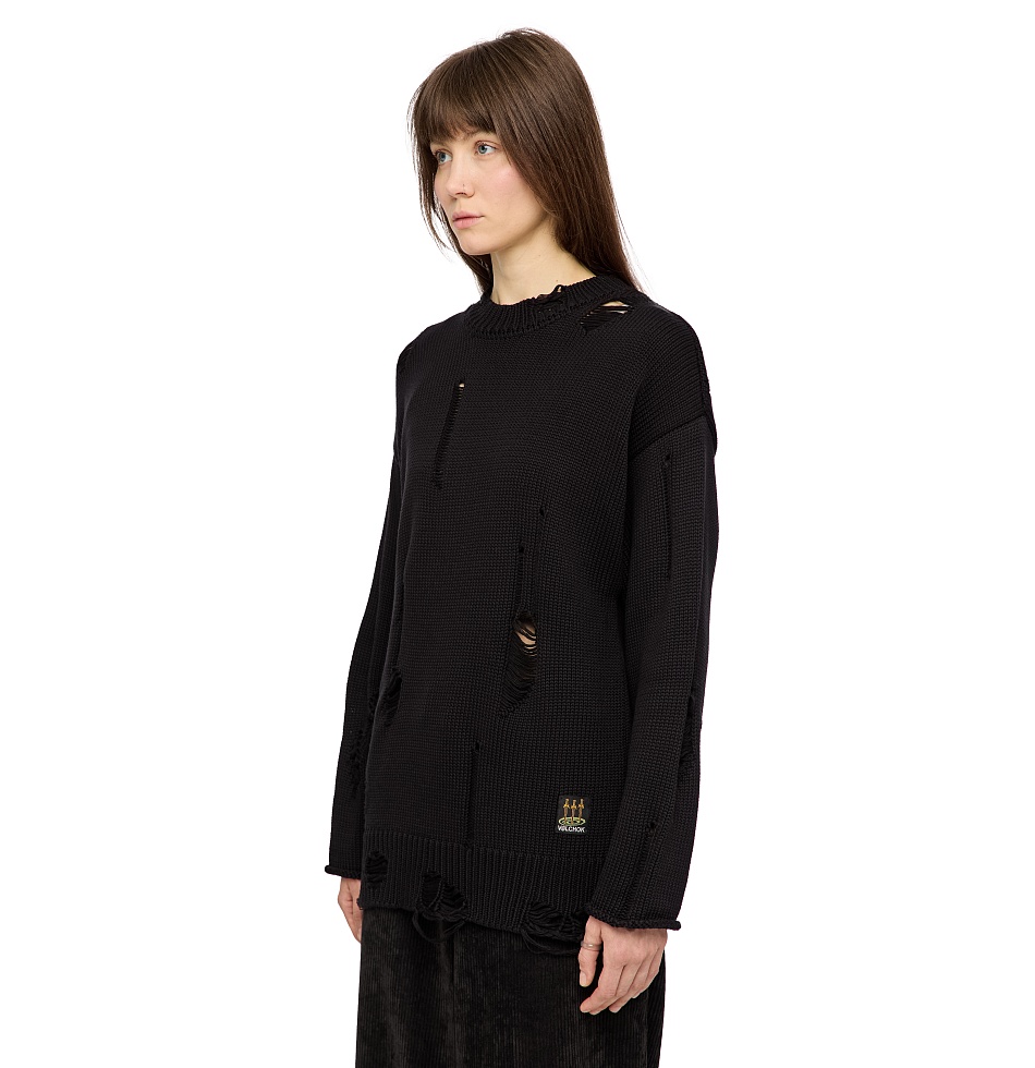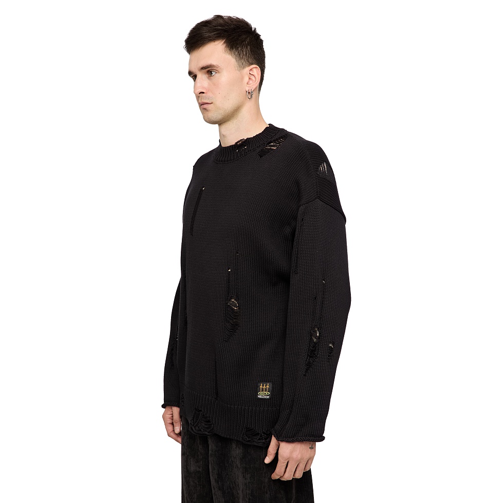 Удлиненный вязаный джемпер с жаккардорм, свободный крой, декоративные дырки, спущенная линия плеча.