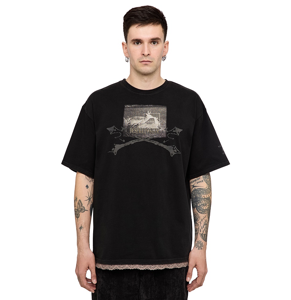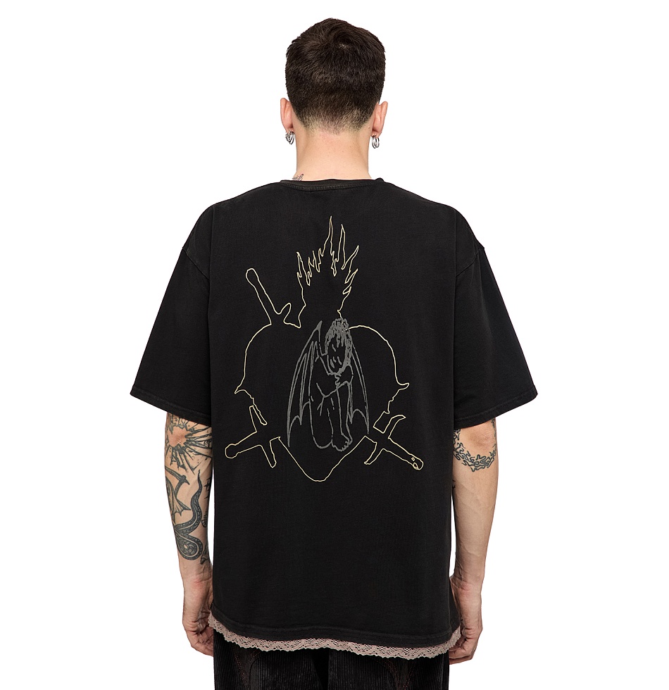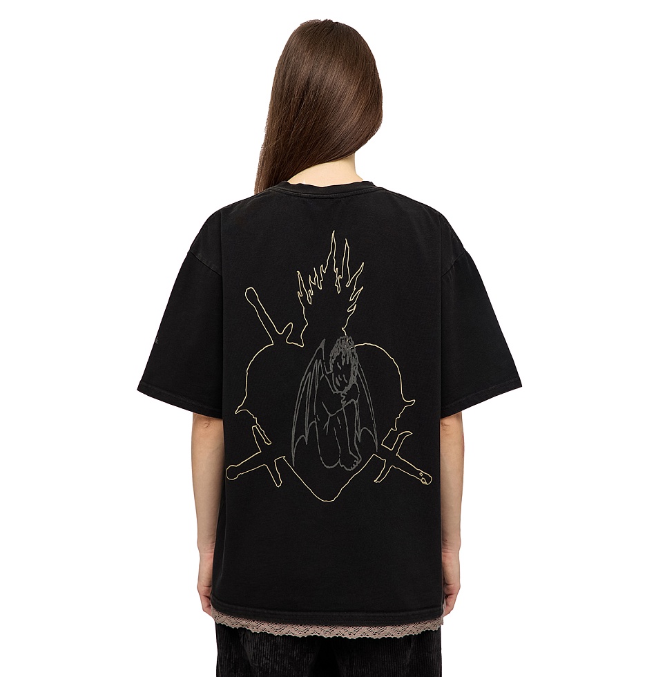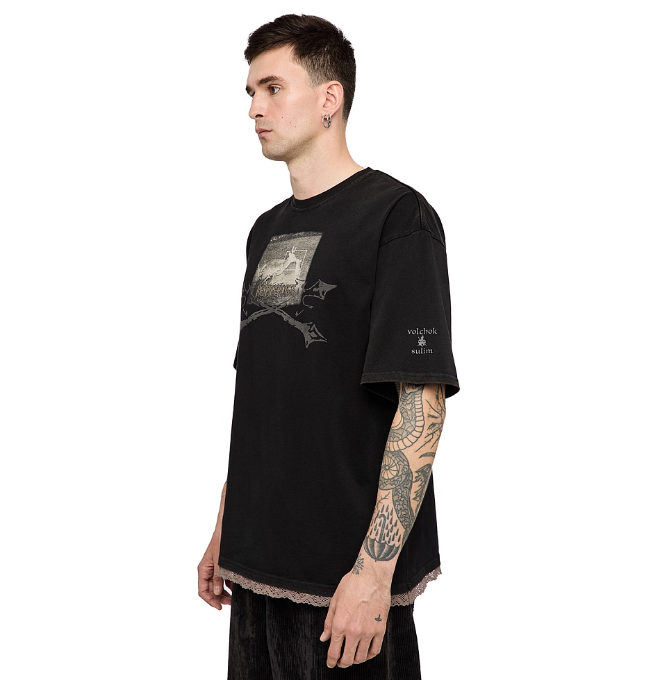 Футболка свободного кроя с круглым вырезом, горловина обработана окантовкой в рубчик, приспущенная линия плеча, втачной рукав, принт шелкография. На Алисе – размер L, ее рост 180 см. На Артёме – размер XXL, его рост 198 см.