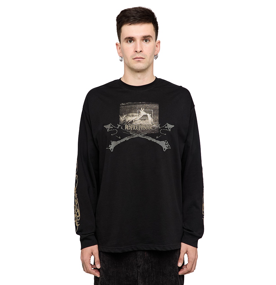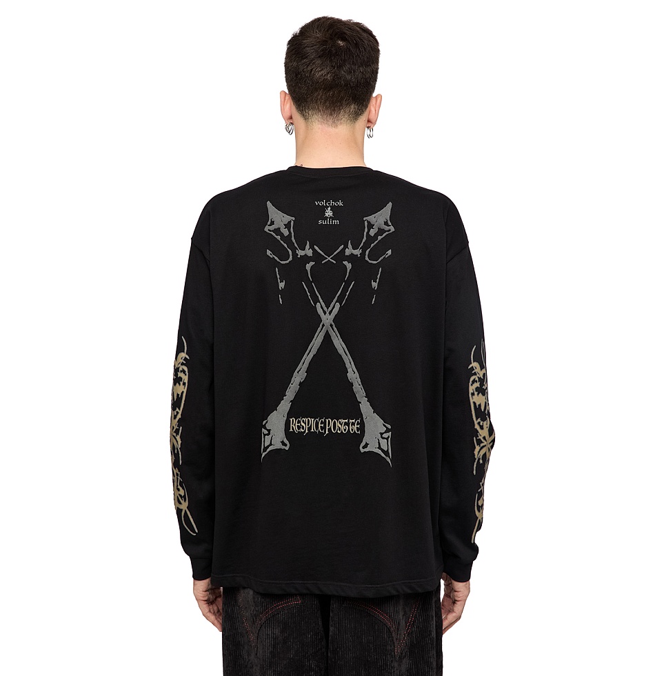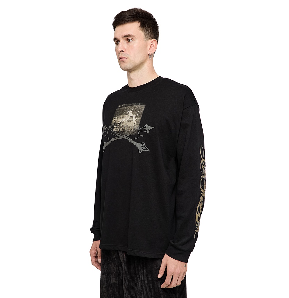 Лонгслив свободного кроя с круглым вырезом, приспущенная линия плеч, втачной рукав, принт шелкография. На Алисе – размер L, ее рост 180 см. На Артёме – размер XXL, его рост 198 см.