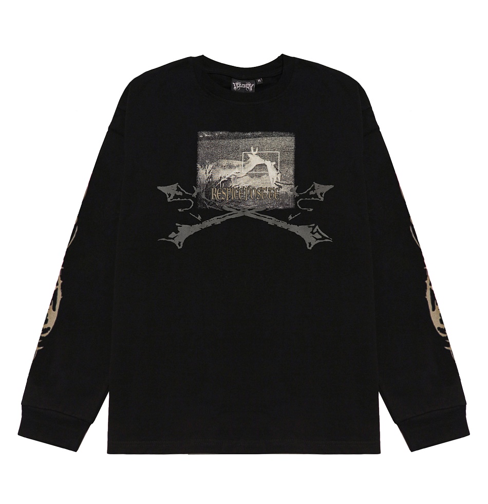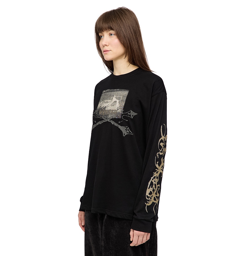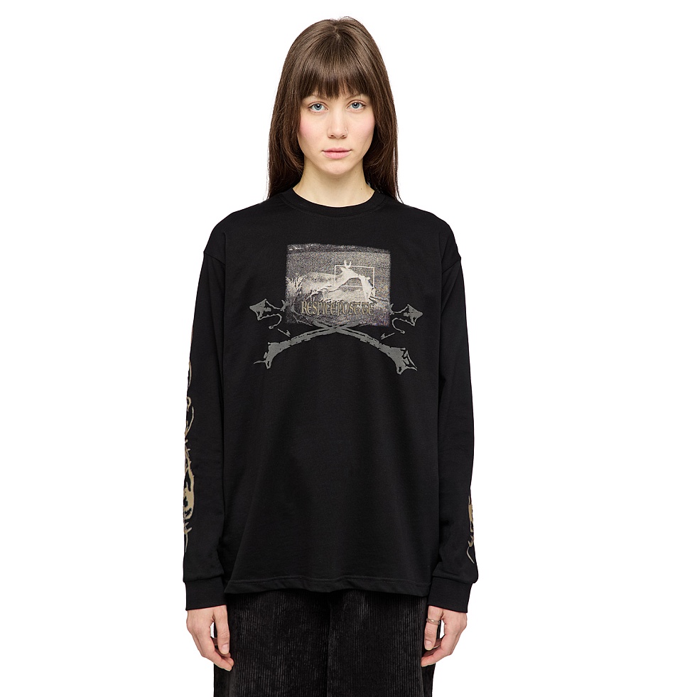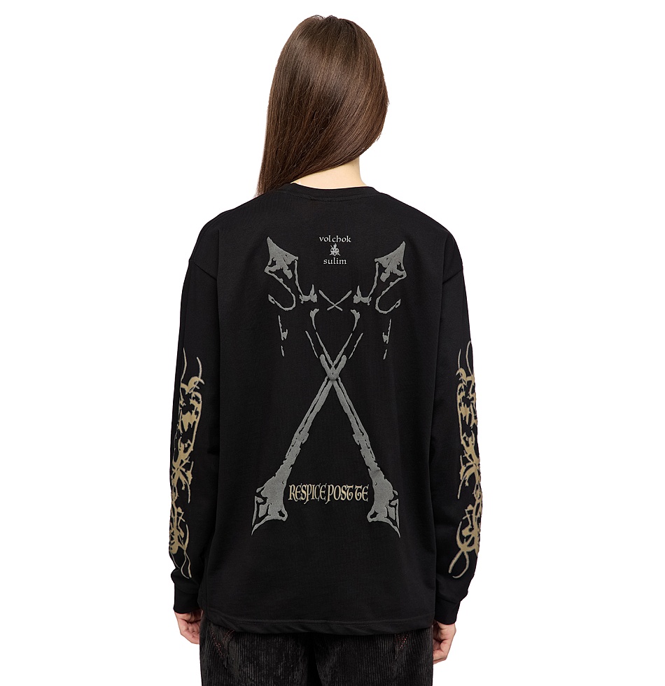 Лонгслив свободного кроя с круглым вырезом, приспущенная линия плеч, втачной рукав, принт шелкография. На Алисе – размер L, ее рост 180 см. На Артёме – размер XXL, его рост 198 см.