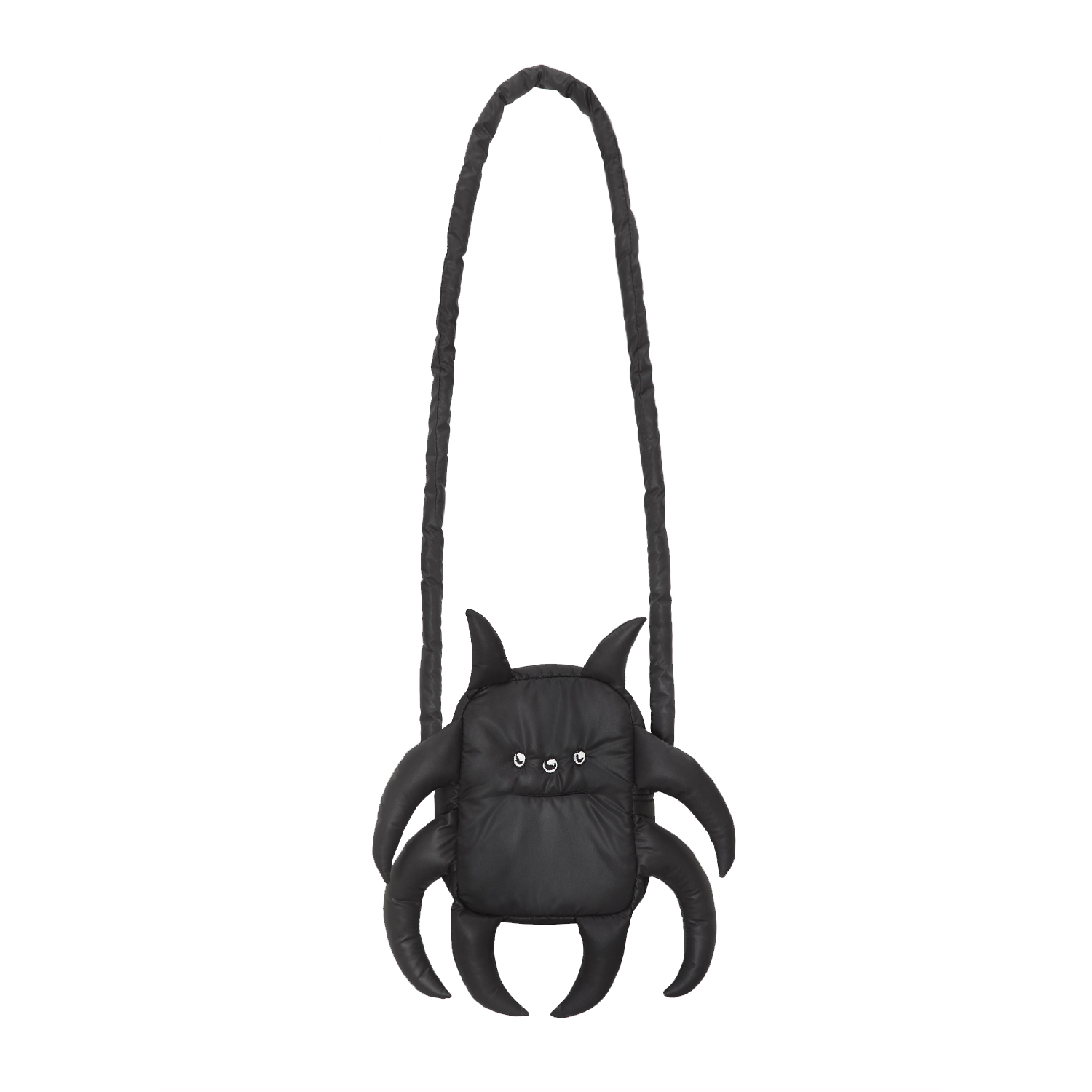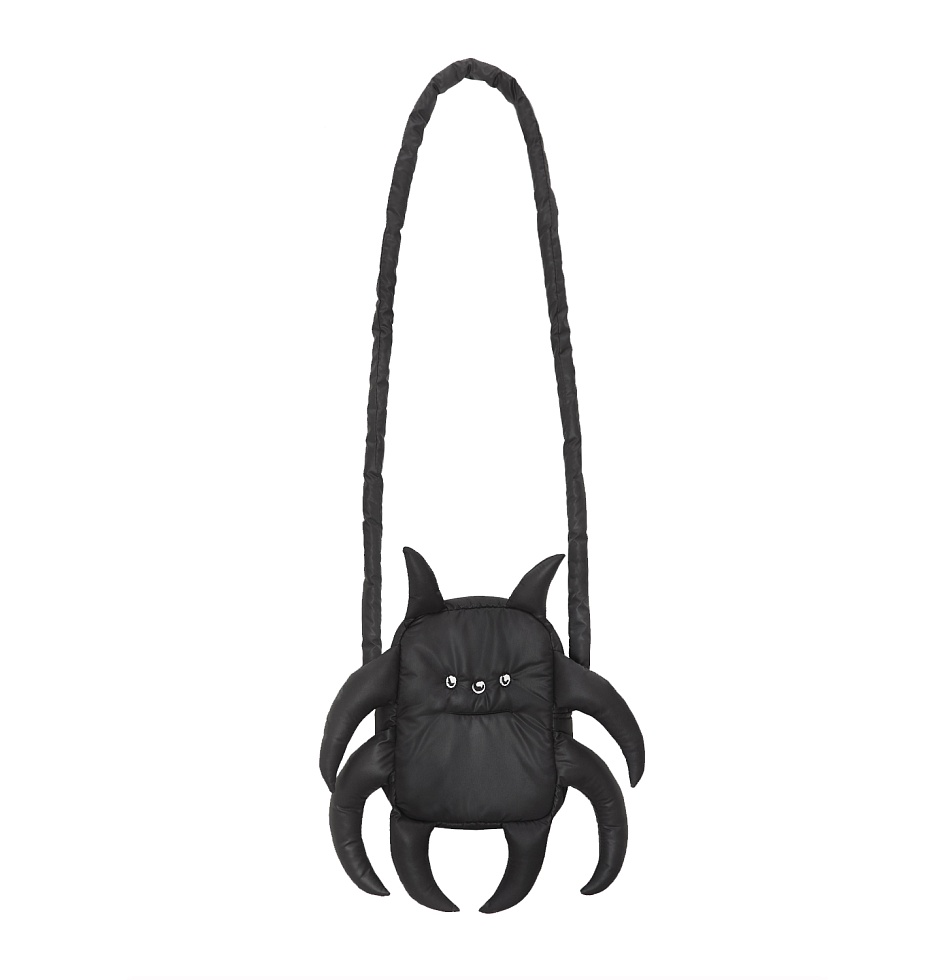Формоустойчивая мягкая сумка с наполнителем из синтепона в виде существа, декорированная по периметру деталями-«щупальцами» и вышивкой с мордочкой. Основное отделение на молнии, внутренний сетчатый карман. Длина ремешка 140 см.