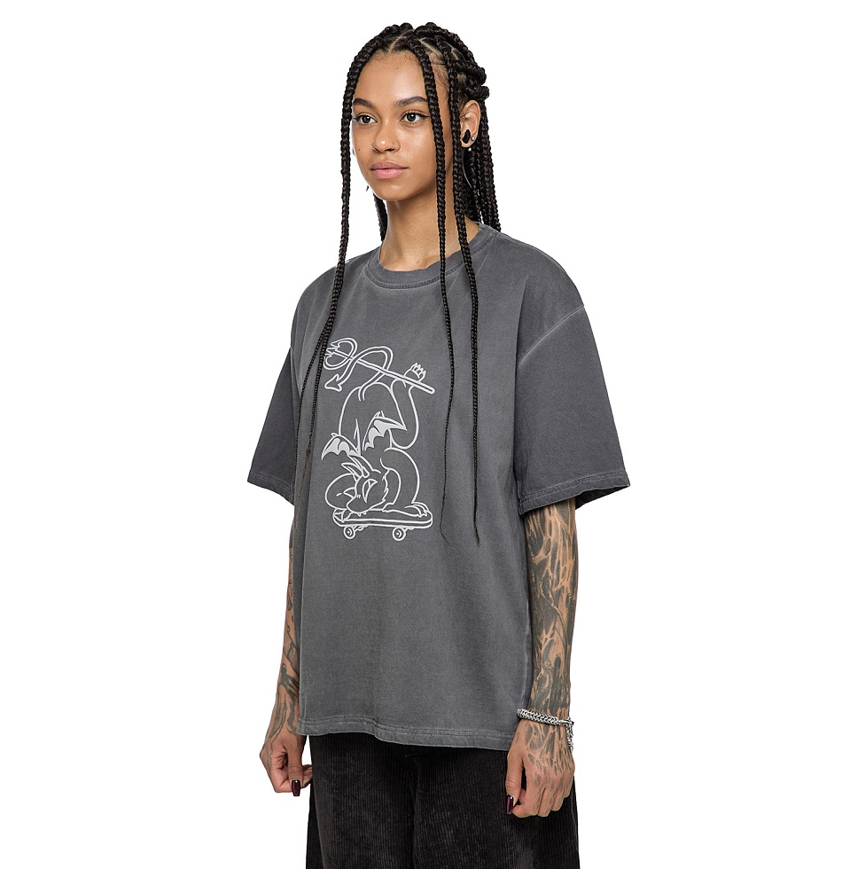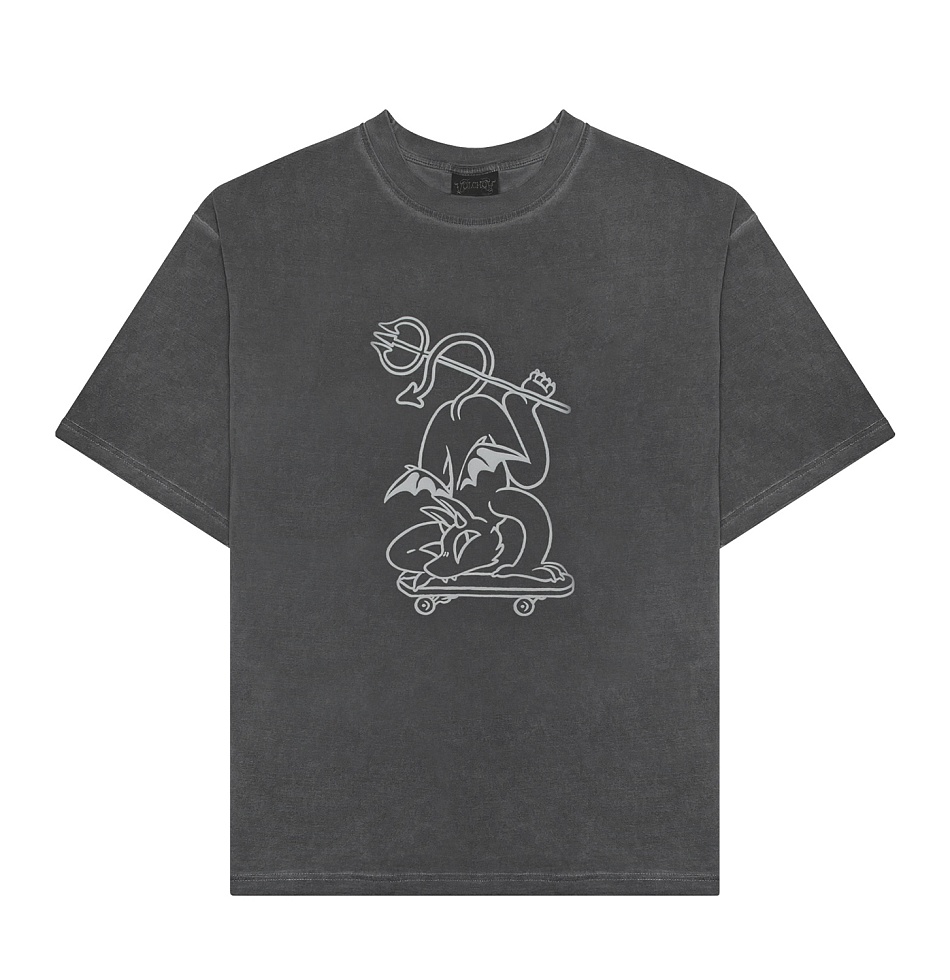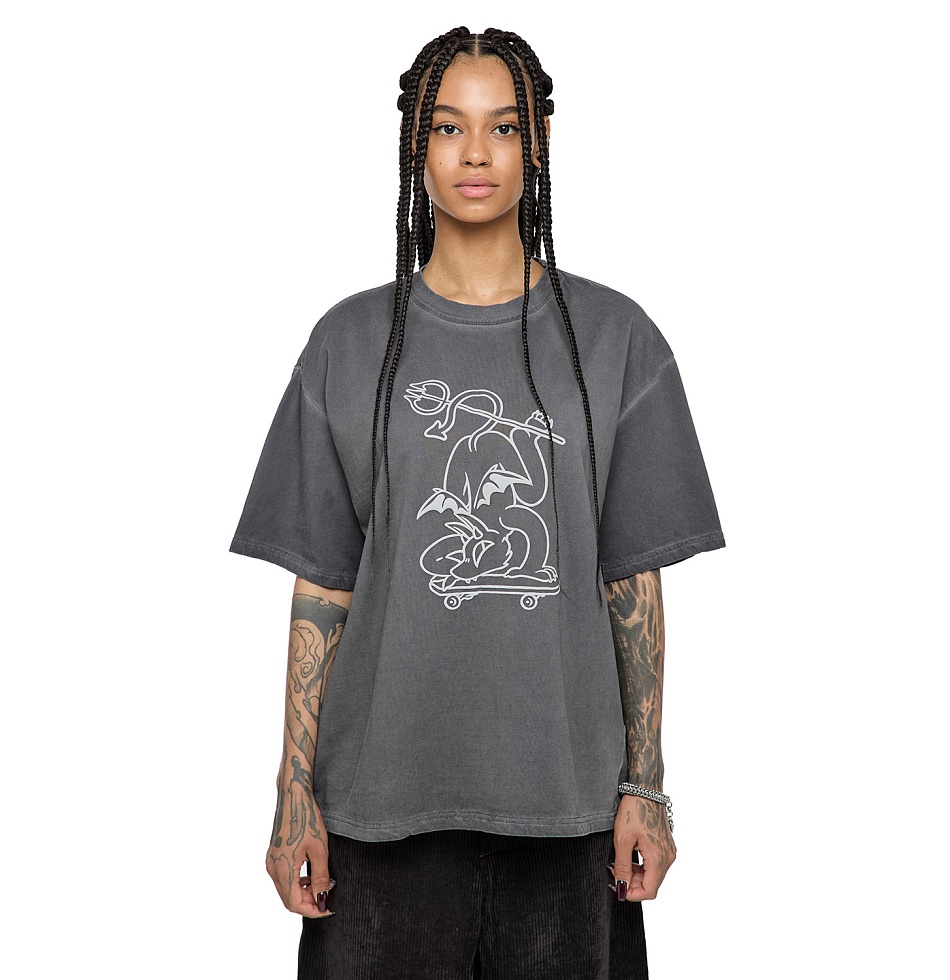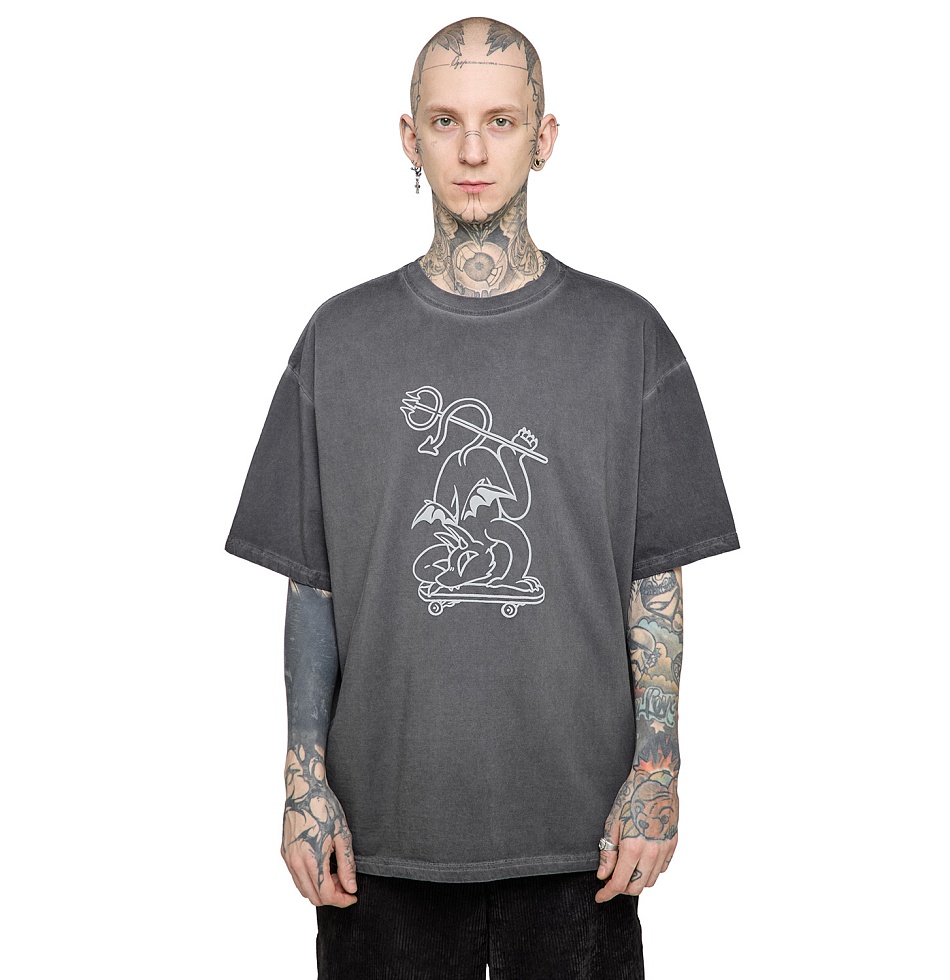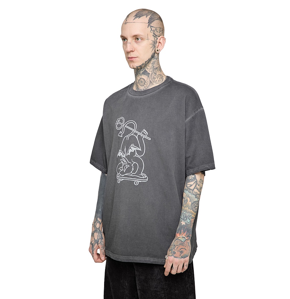 Футболка свободного кроя из плотного хлопка, окрашена по технологии garment dyed, приспущенная линия плеч, втачной рукав, принт шелкография.