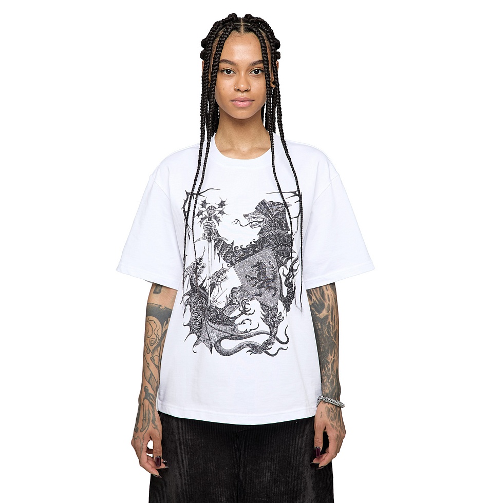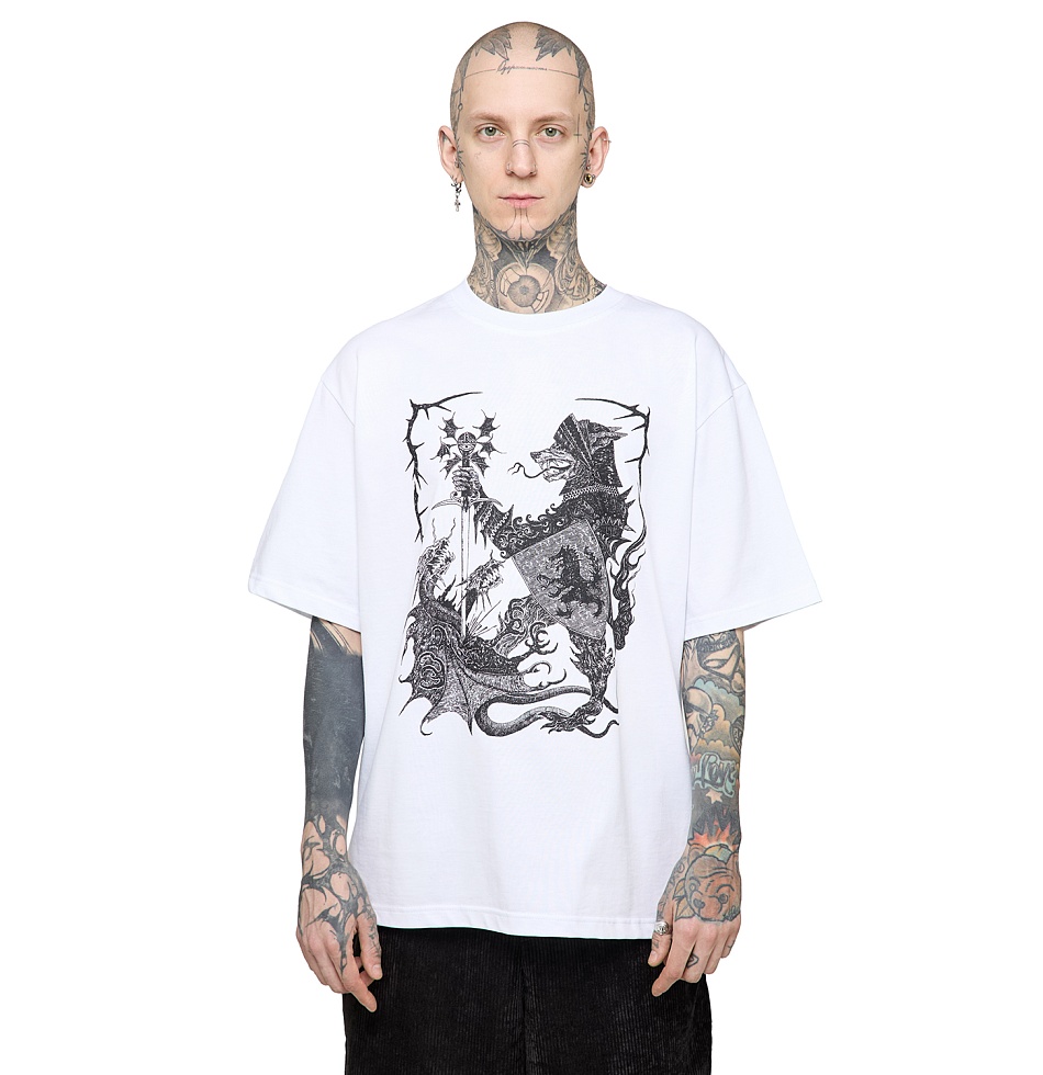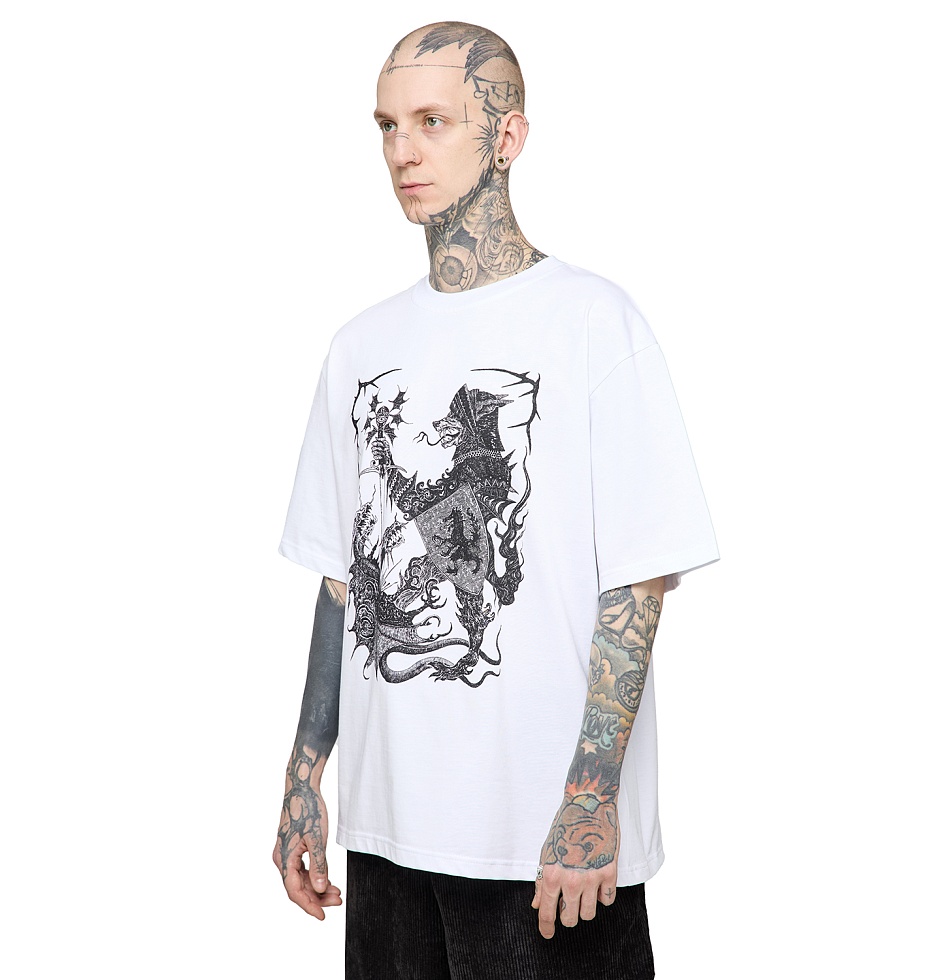 Футболка свободного кроя из плотного хлопка, приспущенная линия плеч, втачной рукав, принт шелкография.