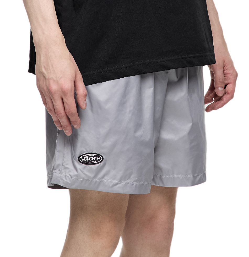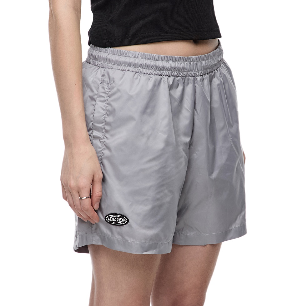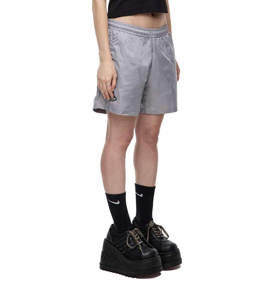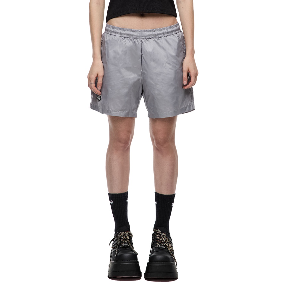 Шорты свободного кроя из переливающейся плащевки. Эластичный пояс со шнурком, два боковых карамана на молнии.