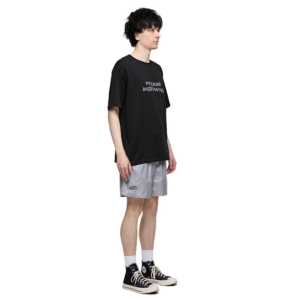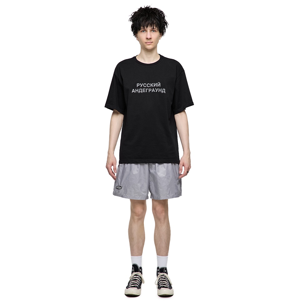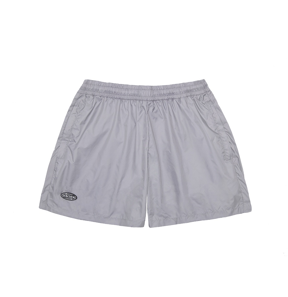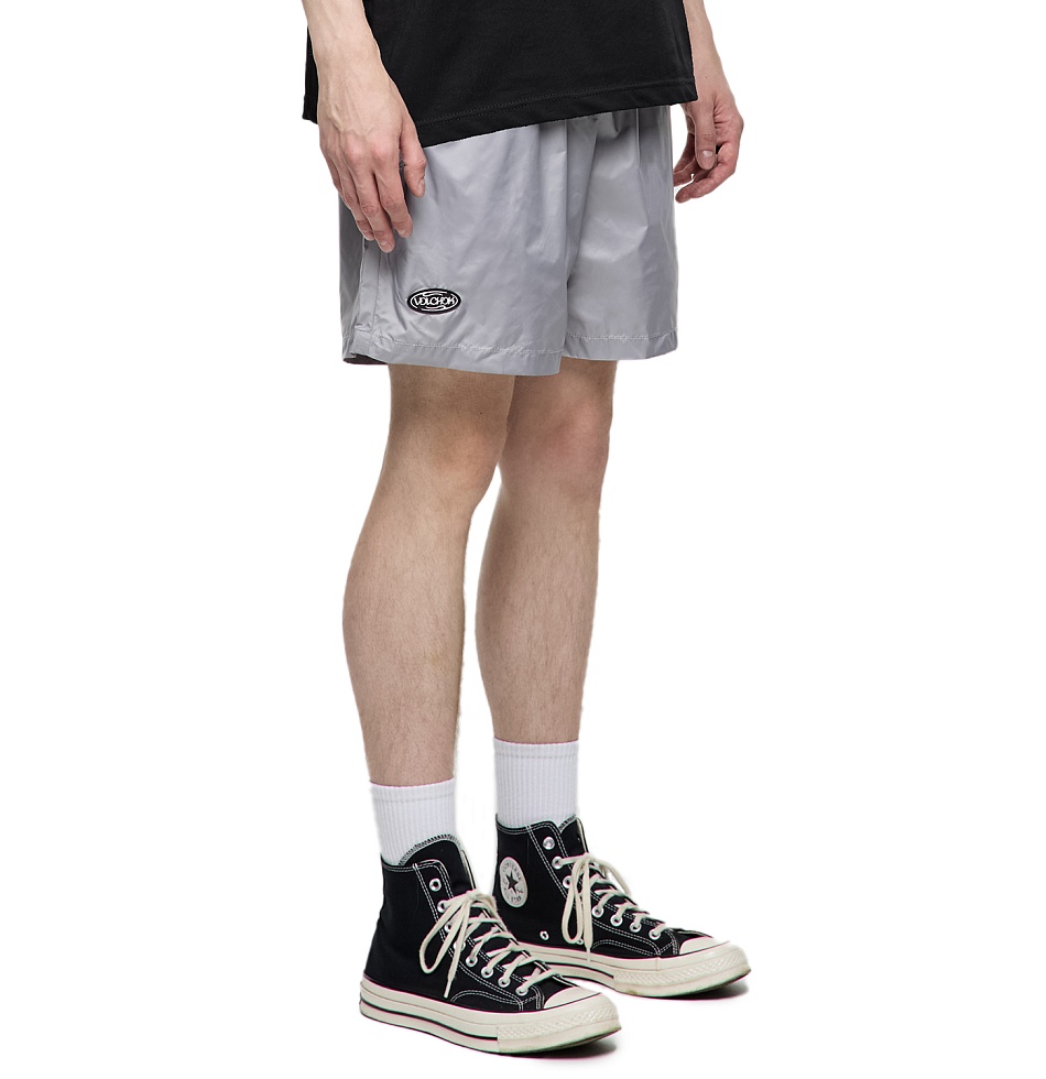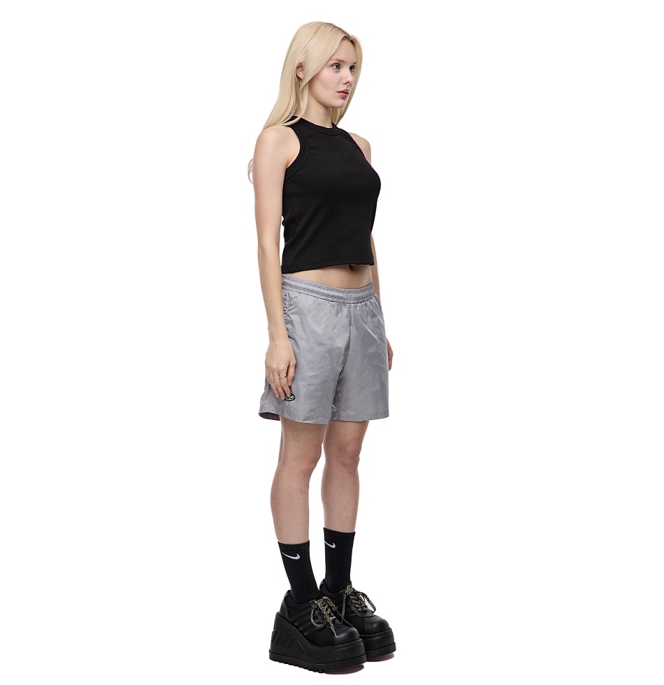 Шорты свободного кроя из переливающейся плащевки. Эластичный пояс со шнурком, два боковых карамана на молнии.