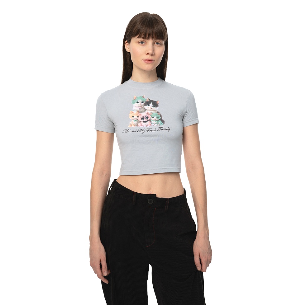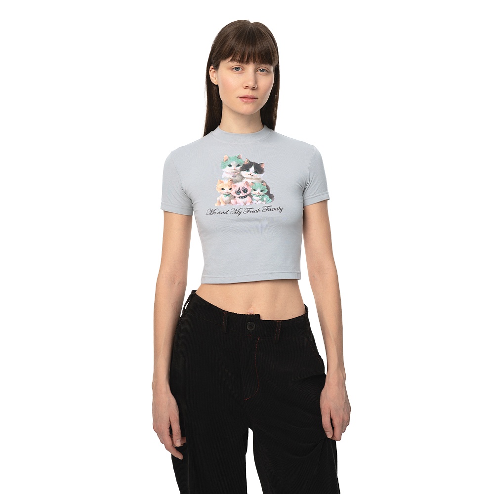 Обтягивающий кроп-топ приталенного силуэта, втачной рукав, принт шелкография.