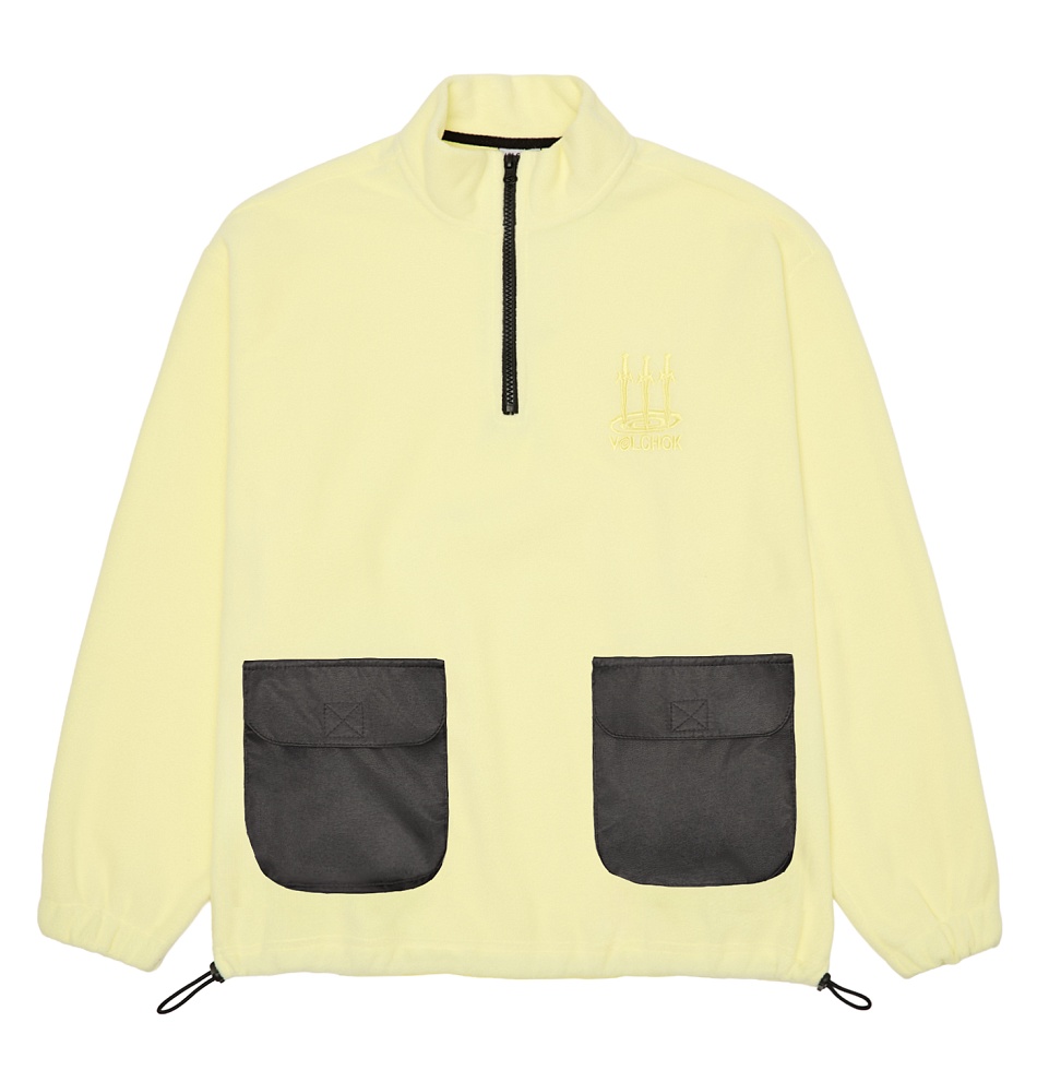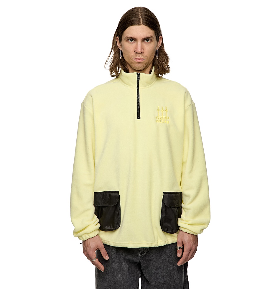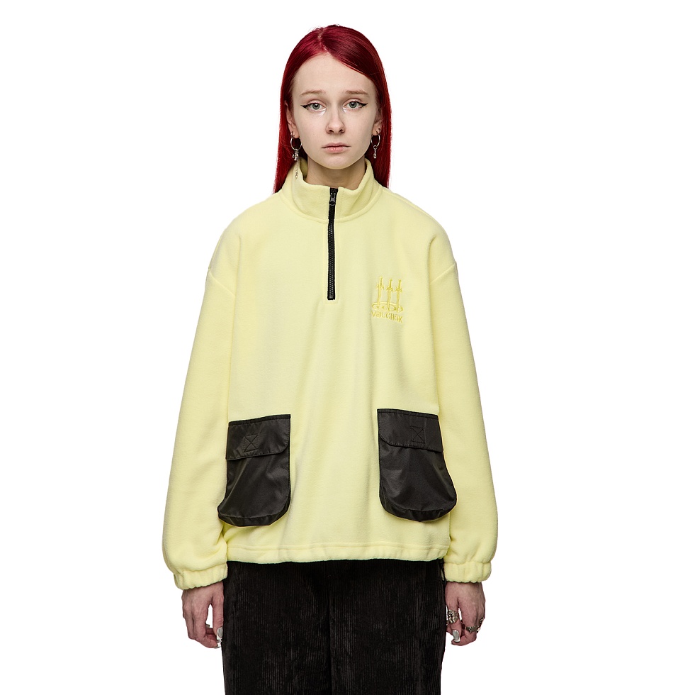 Кофта флисовая с резинкой фиксатором на поясе, вышивкой на груди и двумя накладными карманами спереди.