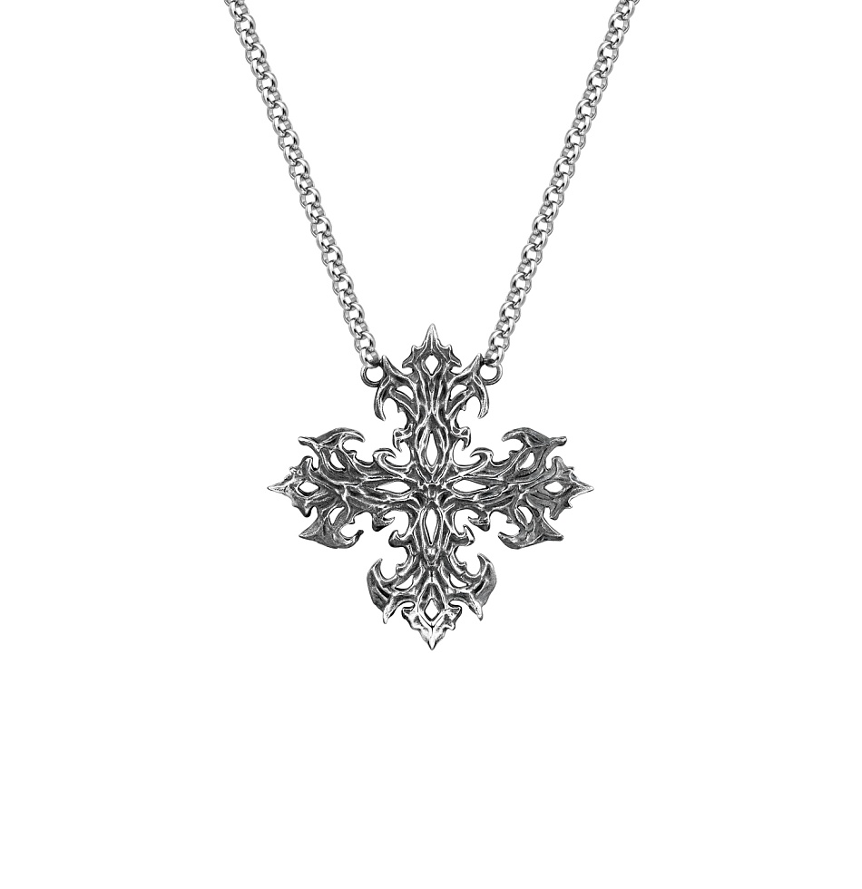Подвеска в виде креста с объемной текстурой на цепочке. Глянцевая полировка, чернение.